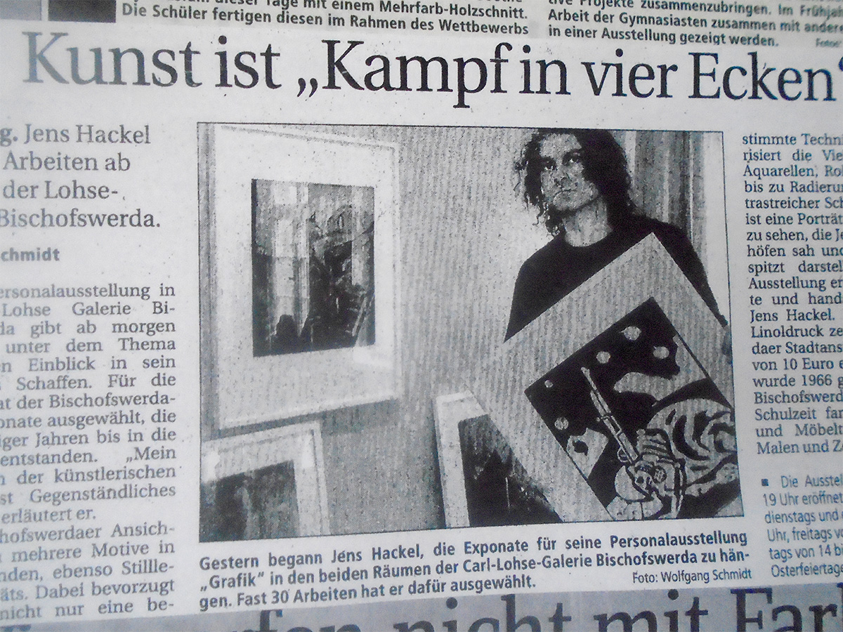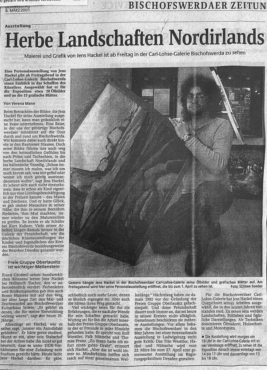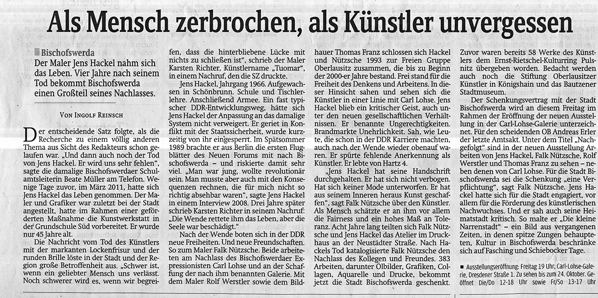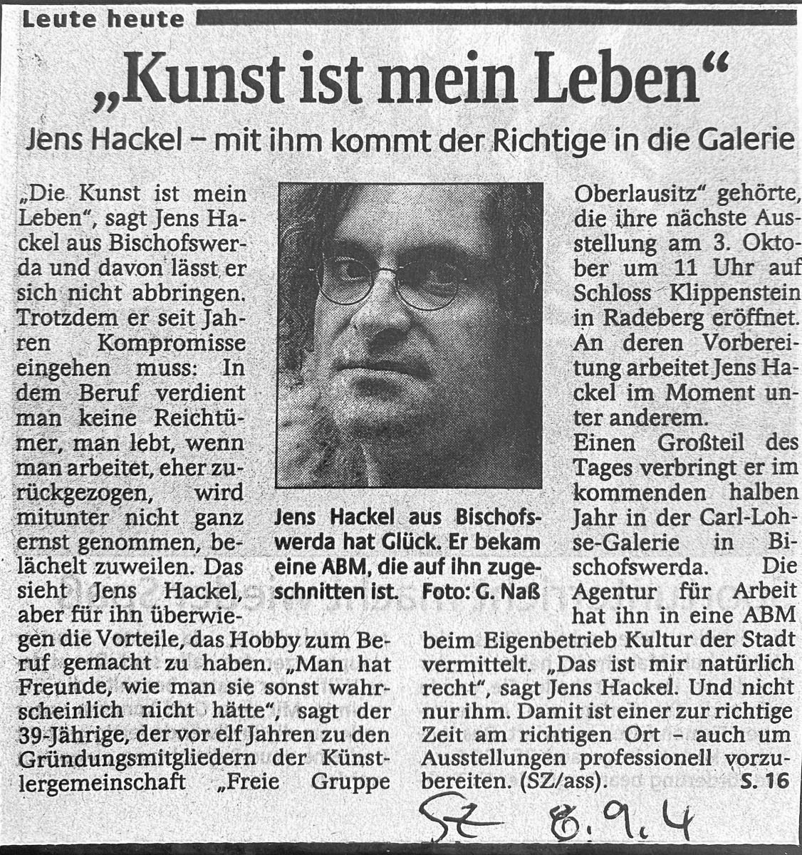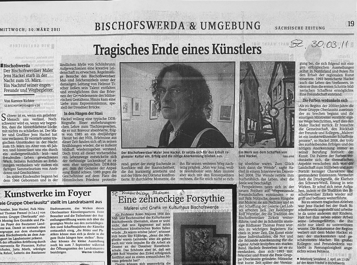 Indem er an den benachbarten stehengebliebenen Brandmauern noch die Baugliederung und Details der einzelnen, verlorenen Wohneinheiten sichtbar beließ, verlieh er unbewusst seinem Ärger Ausdruck, dass die historisch gewachsenen kleinstädtischen Strukturen verfielen und zerstört wurden, ohne dass eine adäquate wertgebende moderne Neubebauung oder Umnutzung absehbar gewesen wären. Hackel kannte Bischofswerda so gut wie keine andere Stadt, und er wusste sie mit anderen Stätten, mit nordirischen Cottages, venezianischen Stadtpalästen am Canale oder dem „Goldenen Prag“ mit der Karlsbrücke und dem Goldmachergässchen zu vergleichen. Am Ufer der Moldau fand er auch das „Tanzende Haus“, ein modernes Architekturensemble, das an eine Tänzerin im gläsernen Faltenrock erinnert, die sich an einen Herrn mit Hut schmiegt. Dieser dekonstruktivistische Bau, der im Volksmund auch „Ginger und Fred“ genannt wird, regte ihn zu mehrfacher Gestaltung an. Aber Legendenbildung findet immer wieder und auch in Bischofswerda statt. Hier erfasste Hackel beispielsweise das von unrühmlichen, durch übernächtigte Zecher geschändete „Seechgässl“, dem er in einem hochformatigen Ölbild eine verschwiegen wissende, heitere Würde wiedergab. Im Holzschnitt „Kleine Narrenstadt 2005“ allerdings ließ er sarkastisch einen wohl golden gemeinten Engel am Marktplatz wahre Sturzbäche bitterer Tränen heulen. Suchte er andere Städte auf - Berlin oder Hamburg - waren es wieder die Viertel, die von alltäglichen Lebensrhythmen beherrscht waren, die er als Motiv ins Auge fasste. Da er auf Staffagefiguren verzichtete, lag über all seinen Stadtlandschaften ein Hauch von Verlassenheit und Melancholie. Wandte er sich den Menschen zu, nahm er sie groß ins Bild. Mitunter porträtierte Hackel sich selbst als Clown - mit der Maske, die lachend alle Ängste, Wut und Bedrängnis verbergen konnte. In der Literatur fand er Identifikationsfiguren wie Walter Rheiners Tobias und Hermann Hesses Steppenwolf, die von tiefer seelischer Zerrissenheit bis zur Selbstzerstörung getrieben wurden, wenn es ihnen nicht gelang, lachend die eigene Unvollkommenheit und die der sie umgebenden Gesellschaft zu akzeptieren. Er las diese Werke mehrfach, reflektierte einzelne Textpassagen in seinen zeitweise geführten tagebuchartigen Aufzeichnungen, in die er auch erste bildhafte Ideenskizzen einfließen ließ. Den von Phobien gehetzten „Tobias“ fixierte er kurz darauf in einer Radierung. Den um nüchterne Analyse bemühten Harry Haller, den „Steppenwolf“, in expressiven Farbholzschnitten. Hier tauchte die surreale, schemenhafte Gestalt des Nachtdämonen wieder auf, die er bei einem Entwurf für den Liedermacher Hans-Eckardt Wenzel geschaffen hatte. Dessen Verse, „An mich nachts“, bezog er in Gedanken ganz auf sich selbst, zitierte sie sinngemäß mit seinem eigenen, statt Wenzels Namen, um sich zu Ruhe und Entspannung zu zwingen: „…Mensch, Hackel, schlaf! Wie bist Du auf den Hund gekommen. Ich habe mir für morgen so viel vorgenommen…“. Die Realisierung eines angesponnenen gemeinsamen Projektes, vielleicht einer Cover-Gestaltung, verlief sich im Sande, aber die Figur des Dämons erschien seitdem in Hackels Arbeiten immer wieder: Anfangs erschreckend und selbst wie erschrocken. Bald aber trat sie, im Ölgemälde „Selbst im Januar 2006“ und in verschiedenen Radierungen als behutsamer „Melancholie“-Engel auf, in dessen Armen sich der Künstler geborgen fühlte. In dieser fiktiven Figur hatte Hackel einen Ausdruck für sein Alter Ego gefunden, das schließlich als selbständiges surreales Wesen in seinen Bildern agierte. Wie ein Gewissen positionierte er es mitten in das Bild „Stillleben im Stillleben 2009“, fragend, ob vom Werk des Malers Hackel wohl etwas Bestand haben würde. Seine Malerei, durchdrungen von zeichnerischen Elementen, hatte eine angespannt-elegante Leichtigkeit gewonnen, die sich auch in einer seiner letzten größeren Arbeiten, dem „Kleinstadtjanuar“ zeigte. Er empfahl darin seine Stadt Bischofswerda der Obhut der von ihm geschaffenen Figur, die mittlerweile allen Schrecken verloren hatte, und wie ein Schutzengel über dem tief verschneiten Marktplatz schwebte, um seine Hand nach dem neu errichteten Stahlmonument zu strecken. Künstler, heißt es, seien die Seismographen ihrer Zeit und der Gesellschaft, in der sie lebten.